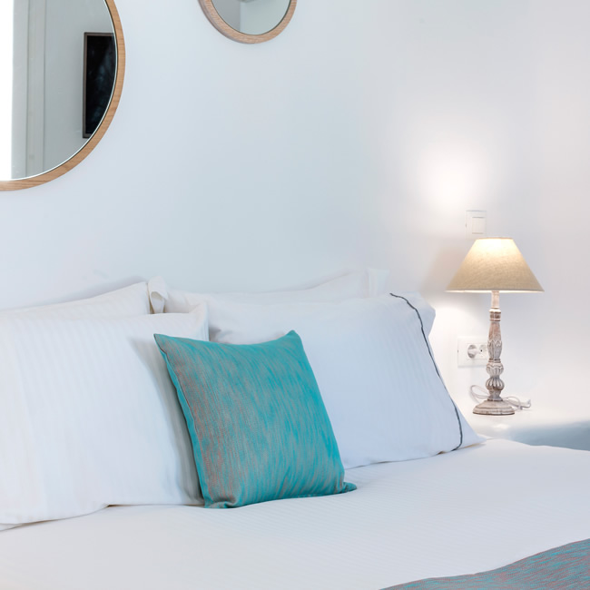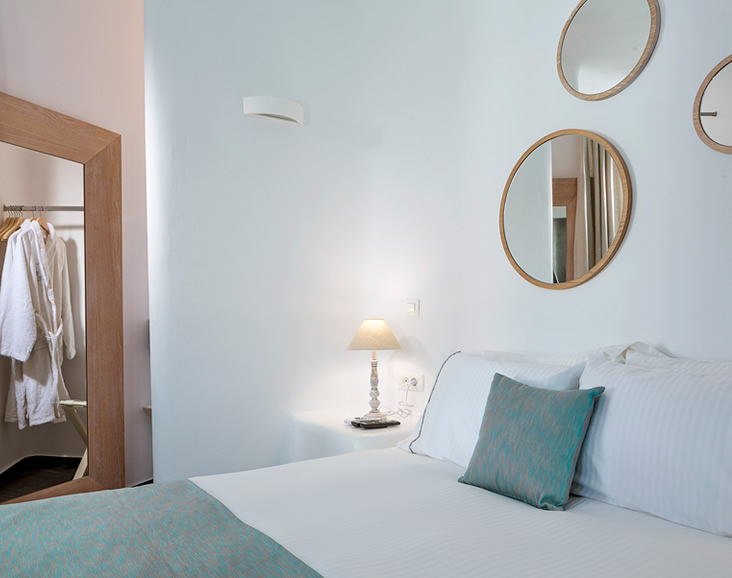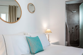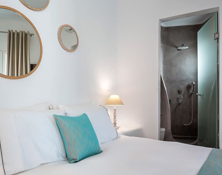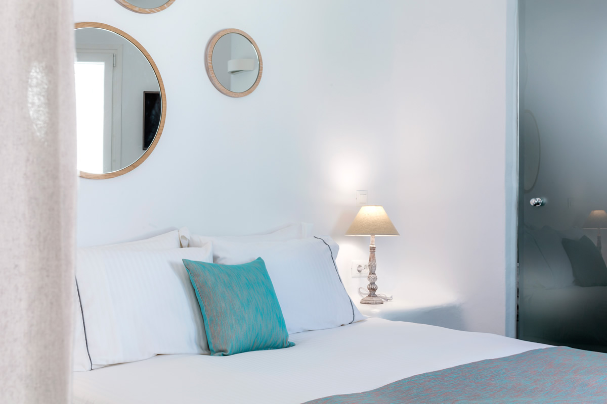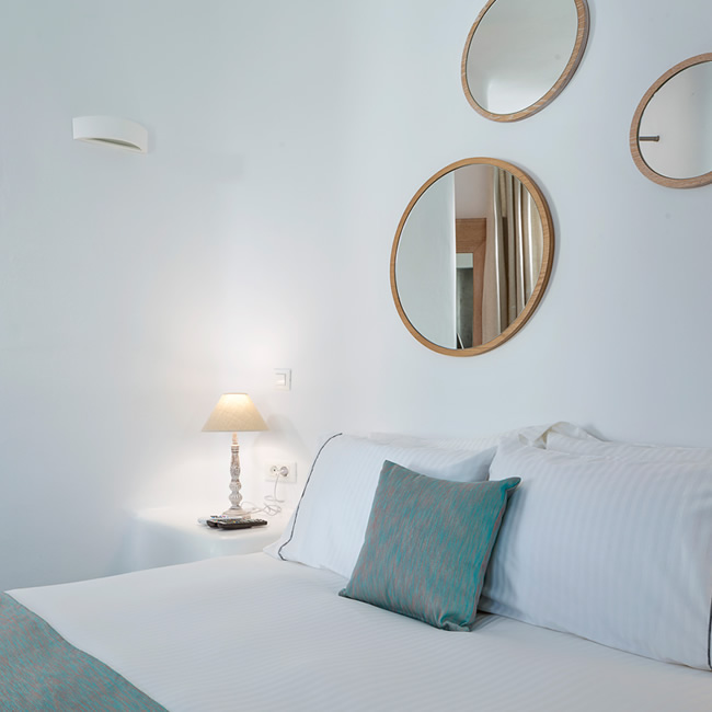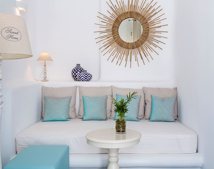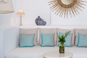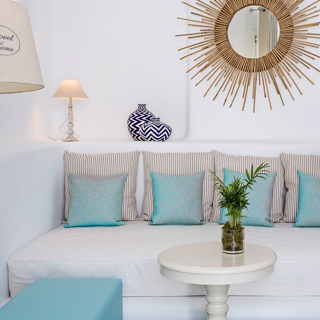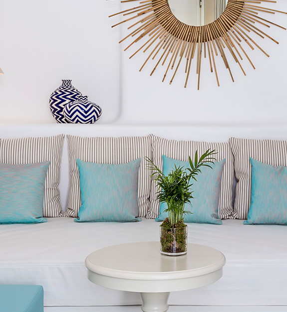 The overall aesthetics, the colours and the shapes of this room reflect traditional elements of Mykonos in a modern fashion.